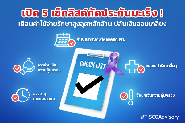 ธ.ทิสโก้ เปิด 5 เช็คลิสต์คัดประกันมะเร็ง เตือนค่าใช้จ่ายรักษาสูงสุดหลักล้าน ปล้นเงินออมเกลี้ยง